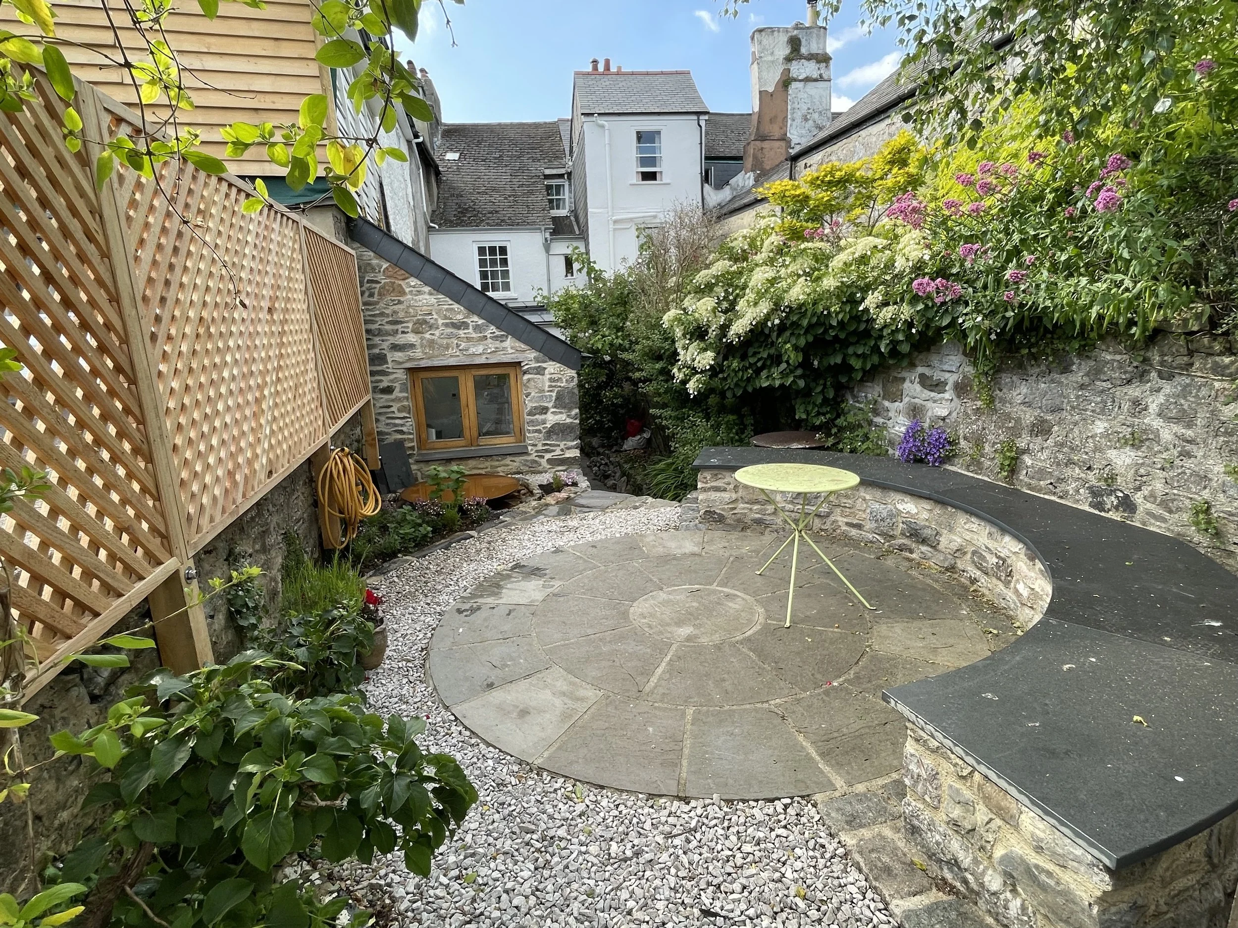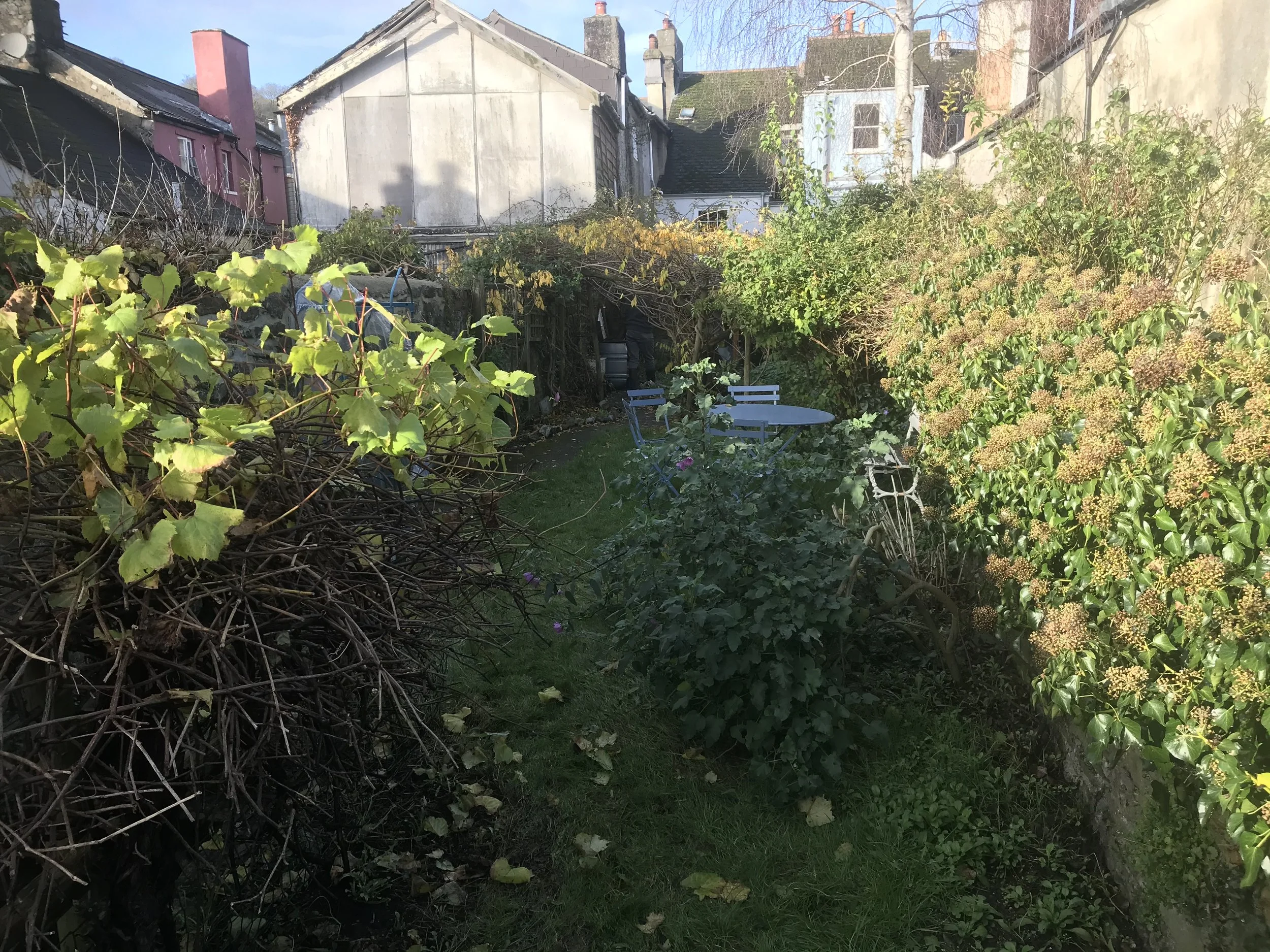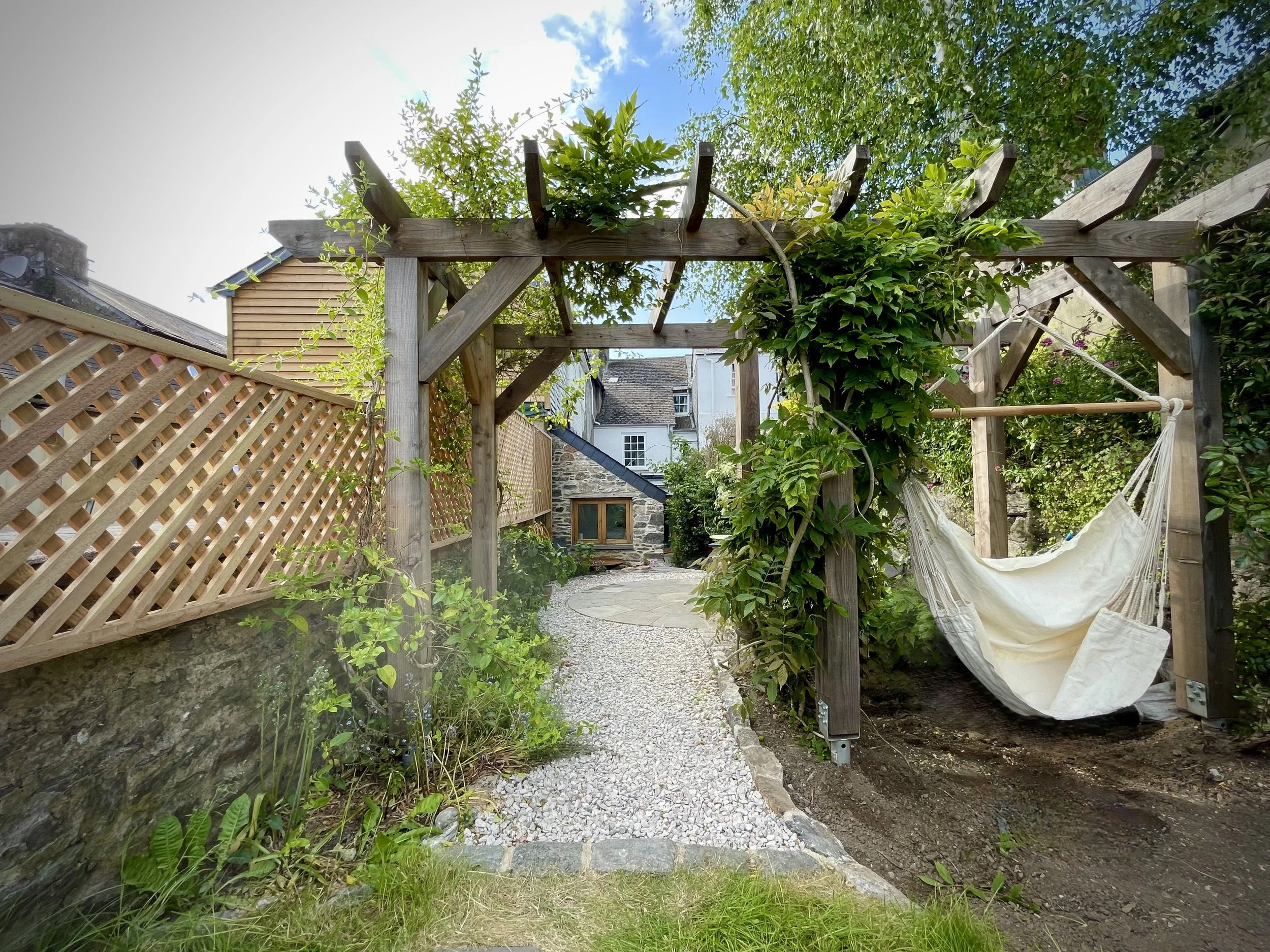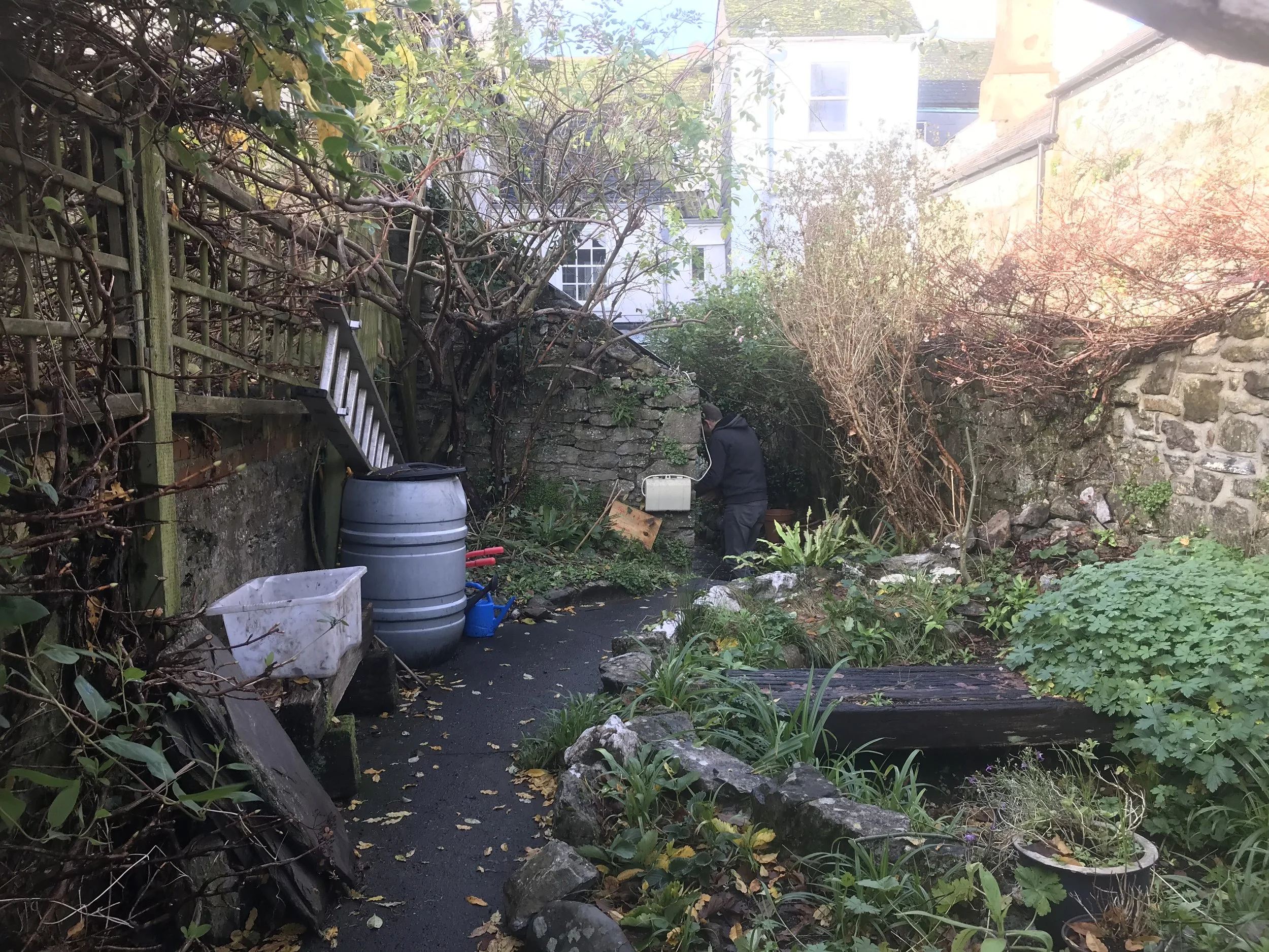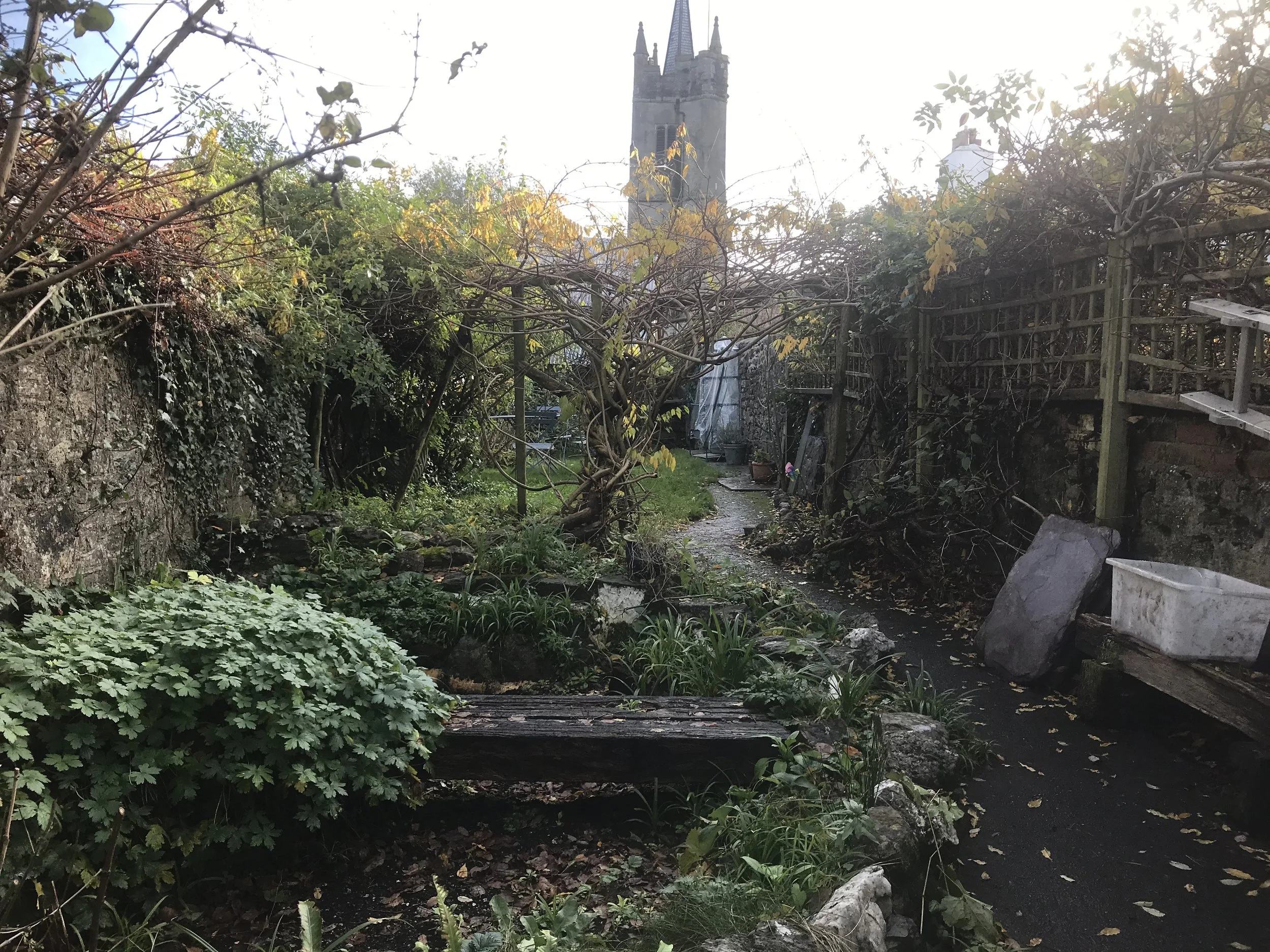 • After an out house-to-office conversion by Joe Bellows & Associates was completed, we worked with the clients to design a scheme that would revive this limestone walled, corridor garden. Typical to dealing with long spaces, we created ‘rooms’ as you move through the garden. After removing the old concrete pond, the first room was build for basking in the the warm sun on a curved slate bench sat on top reclaimed limestone from the site. We kept the view from the new office window, looking towards the church tower open, by placing a weathering steel water bowl in the bed in front. The (locally grown) cedar diamond trellis was build to size by Joe Bellows & Associates, and created a gentle privacy from the neighbouring buildings. Central to the scheme was a pergola, designed to separate the spaces, and provide a frame for an existing wisteria and hydrangea, as well as a hammock swing seat. We decided to used screw pile foundations for this to avoid the use of concrete and minimise damage to the wisteria roots.