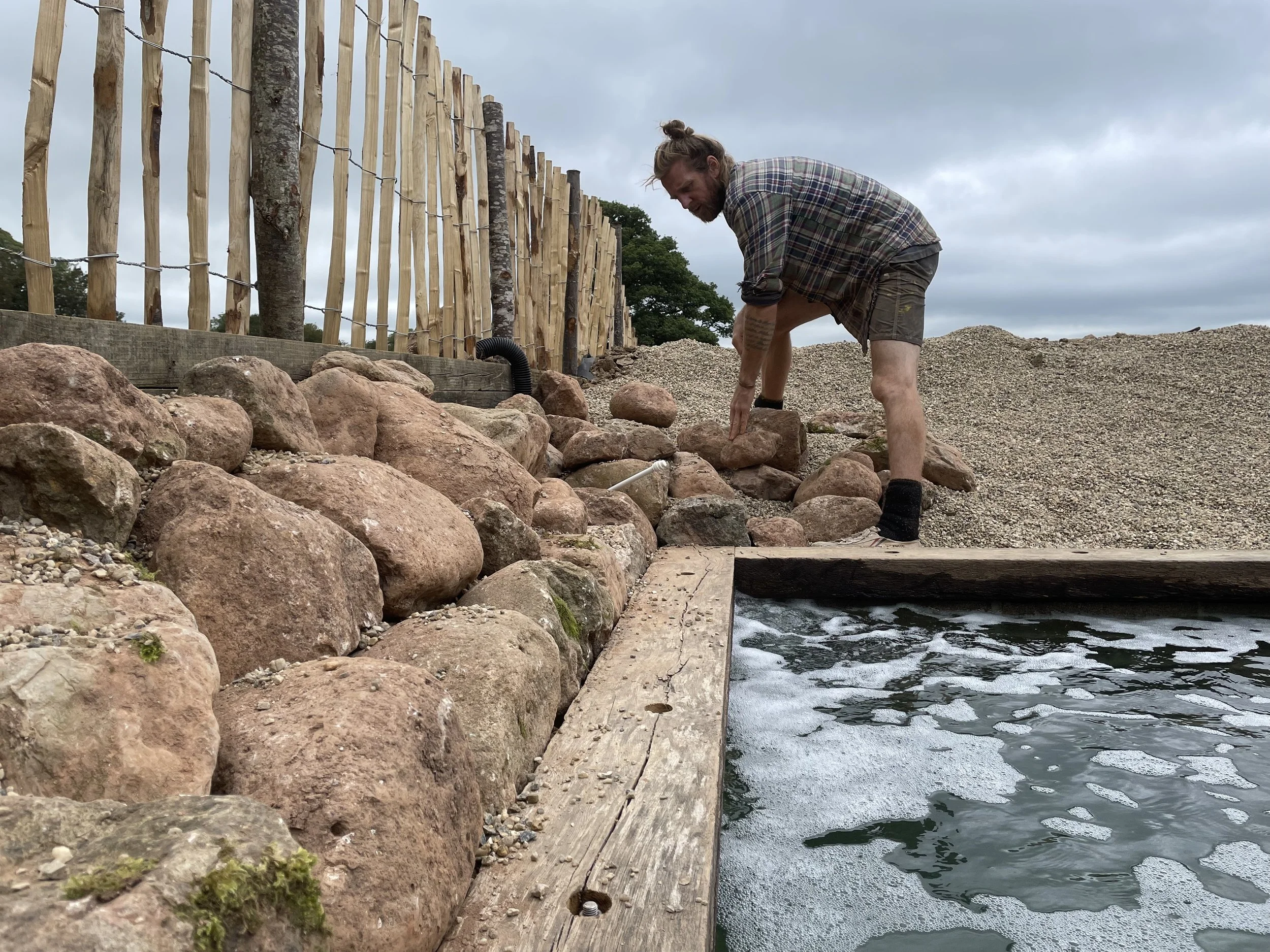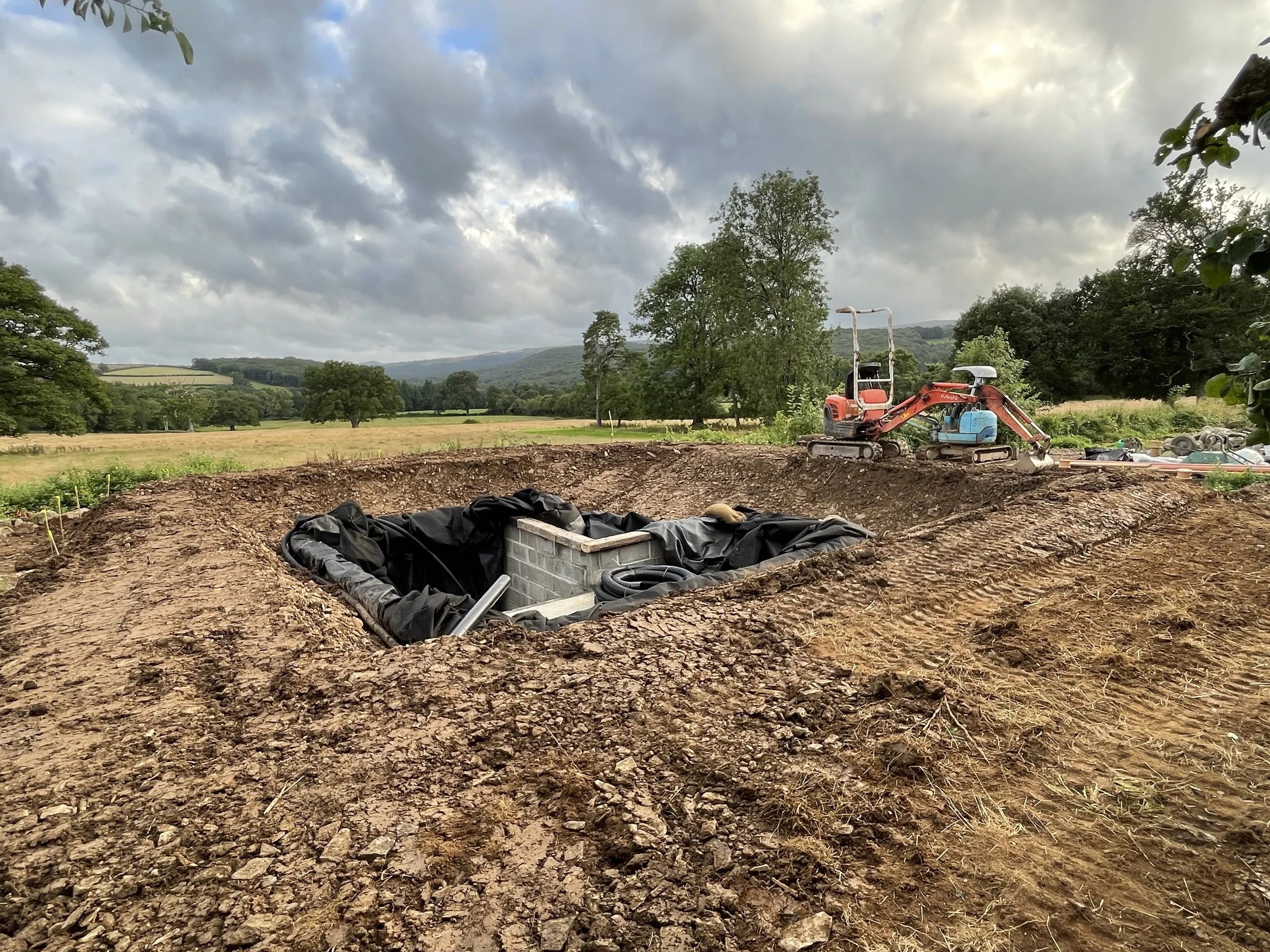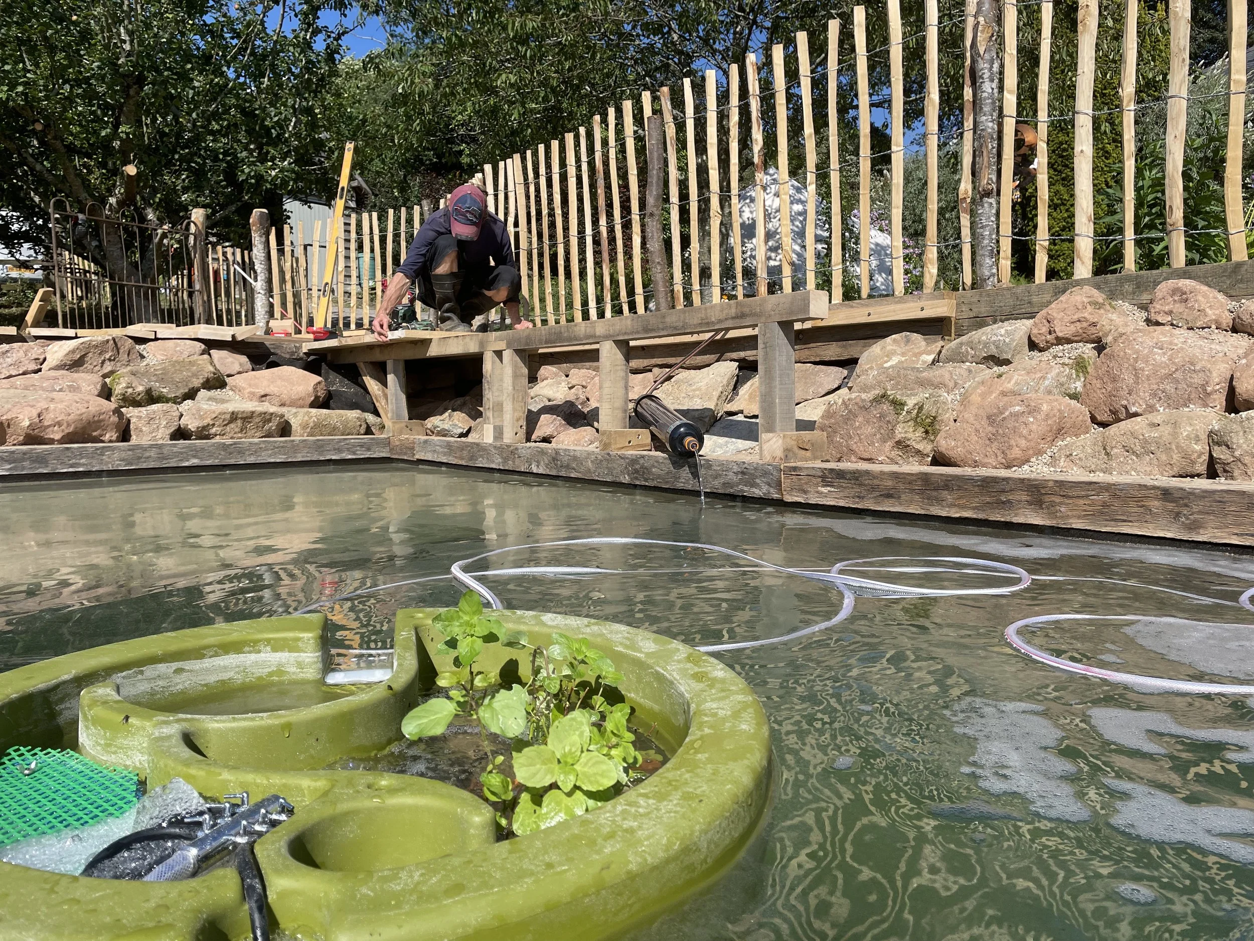 This small natural swimming pond in a garden in South Devon uses a design by the legendary David Pagan Butler. After the design was adjusted to fit the clients needs and the site, we built the pool, and an overflow dry pond to prevent overflow runoff into the neighbouring field. It has a shallow, 2 foot deep zone for little ones to swim in, as well as a 7 foot deep zone to plunge into. The pool is fed by rain collected from the garage roof and occasionally topped up with carbon filtered tap water if there is a hot and dry spell. The filtration system uses an aquarium air pump to draw water through a maze of perforated pipes that run by the roots of the pond plants. By absorbing the nutrients from the passing water, the plants filter the pool in the gentlest way possible. As an alternative to impeller pumps, this helps preserve the more delicate pond life. The root zone filtration system is complimented by an air pump driven, floating biofiltration skimmer, named the ‘Olive’. We used local sweet chestnut posts and paling for the fence, reclaimed oak sleepers as edging & steps and local sawn oak for the jetty. The pond plants were sourced from Devon Pond Plants.